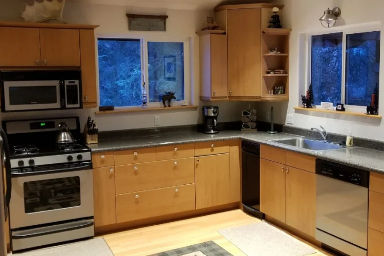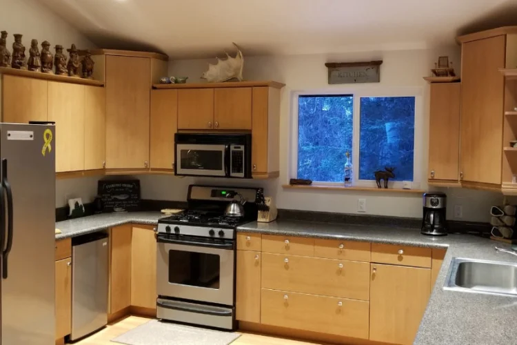 Full deluxe kitchen with gas stove, microwave, coffee maker, dishwasher, beverage fridge, toaster.