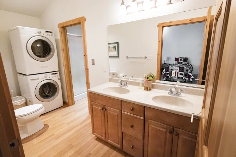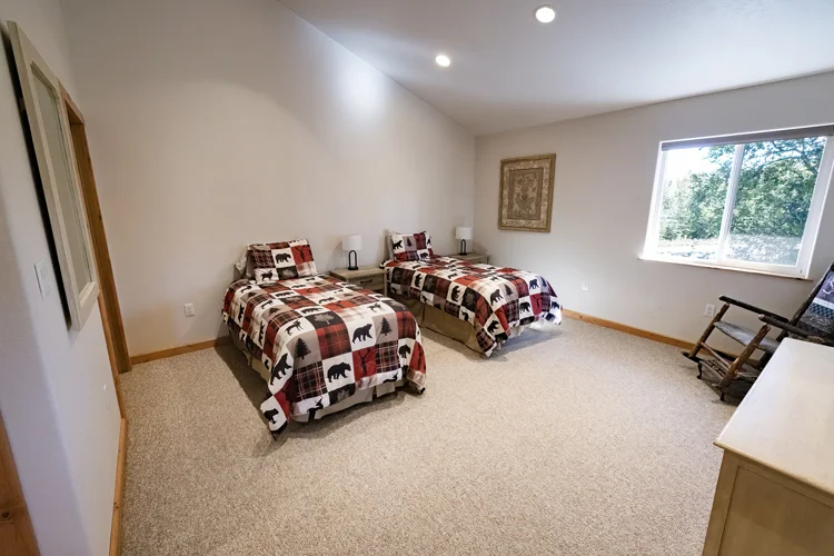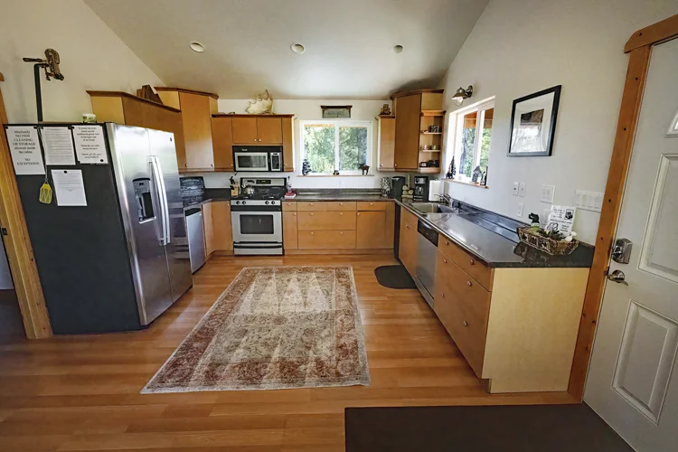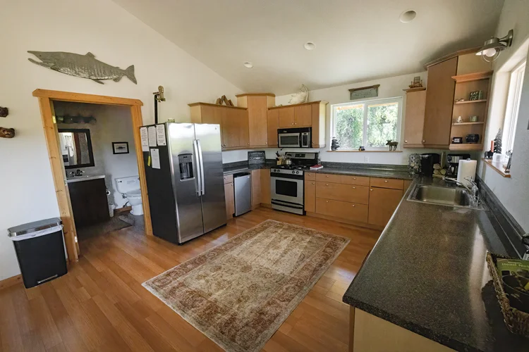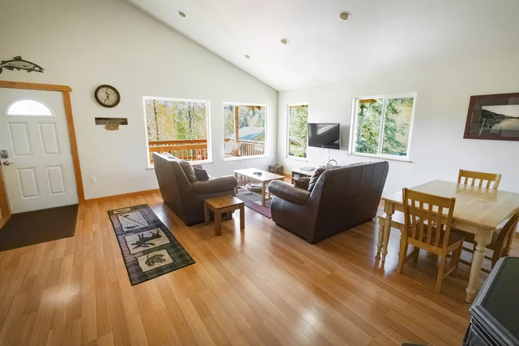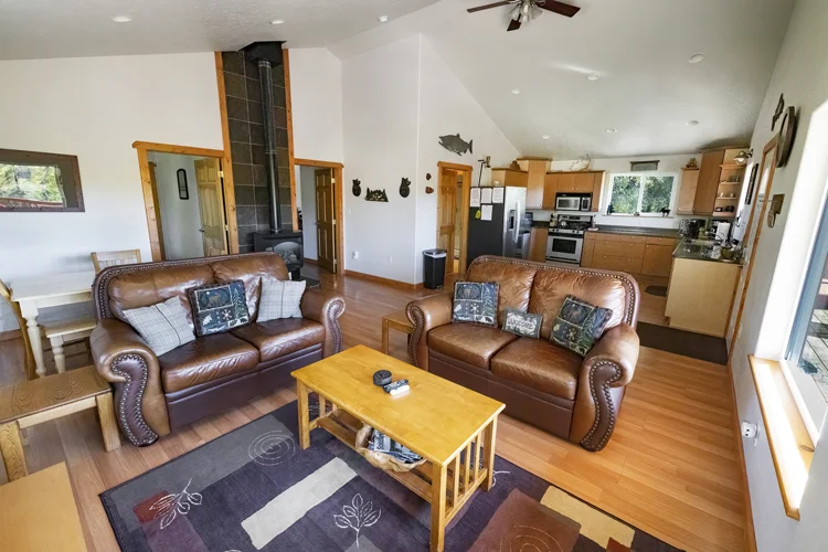 It includes two bedrooms, two bathrooms, a deluxe kitchen, washer/dryer, flat screen smart TV, Starlink WiFi, covered outdoor deck, and a gas barbecue.  The cabin is just a short walk to the river and private fishing access.